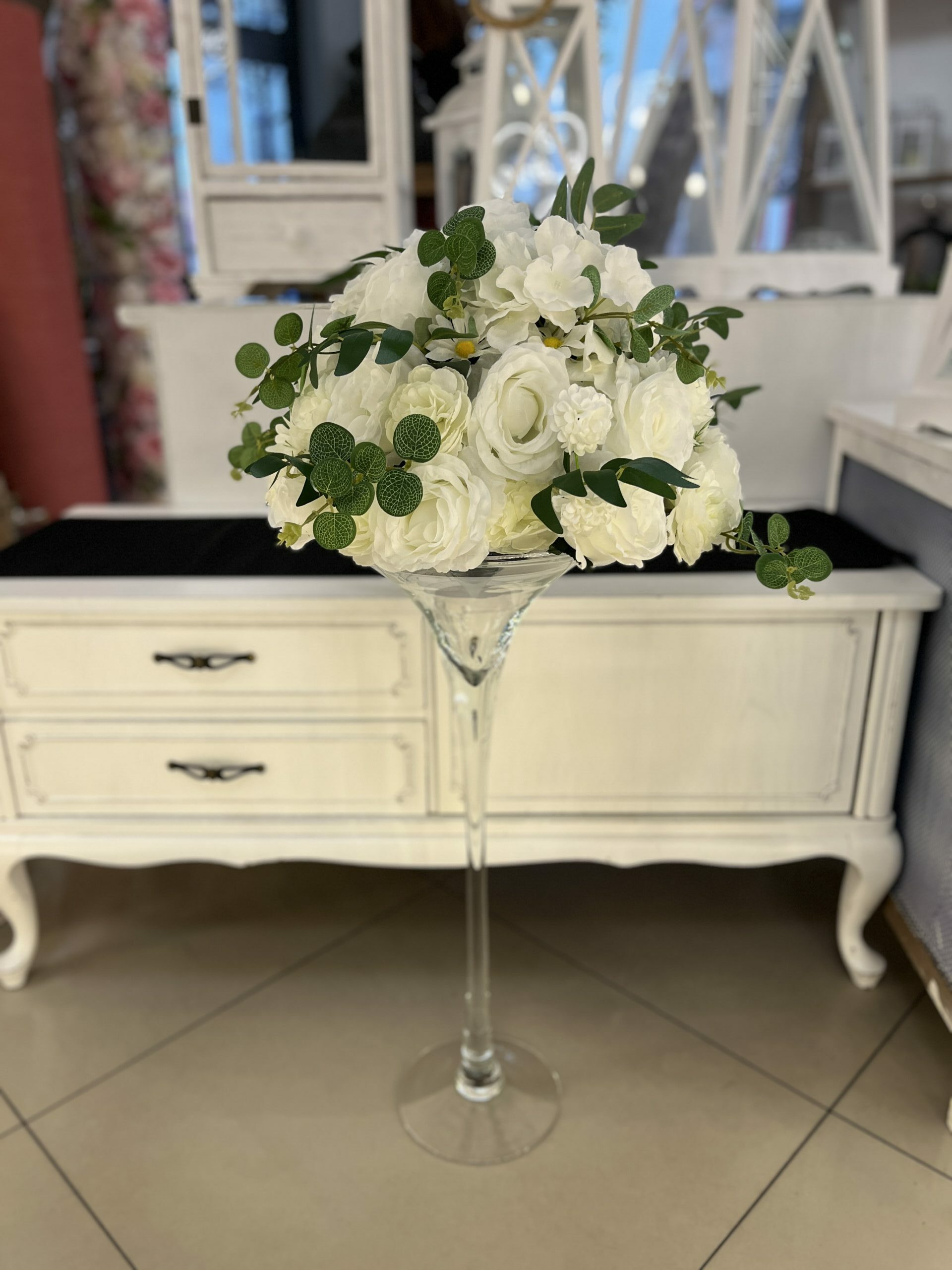 Kula ze sztucznych kwiatów, idealna do postumentów oraz wysokich martinówek. Są piękną ozdobą na ślubie i weselu, kiedy potrzebujesz budżetowego rozwiązania i nie wiesz co później zrobić z żywymi kwiatami.