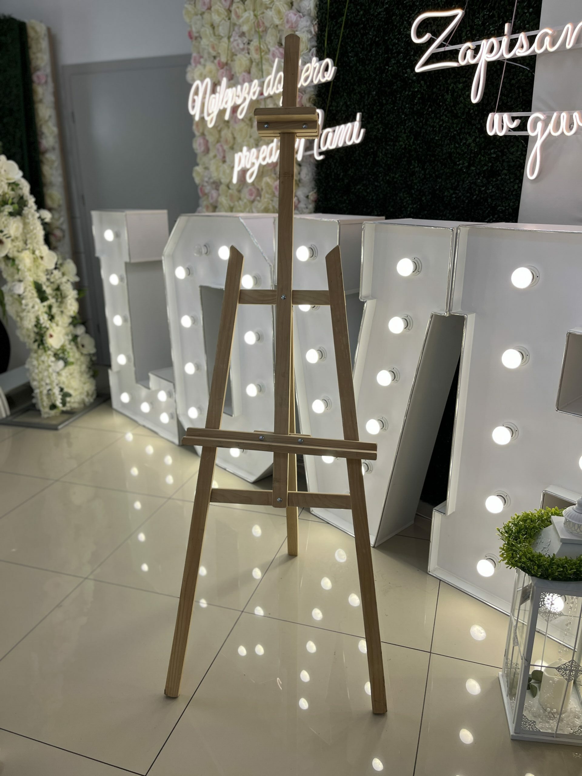 Drewniana sztaluga na tablicę powitalną, informacyjną lub z opisem miejsc przy stołach. Idealny i praktyczny detal na imprezy, wesela i inne eventy.